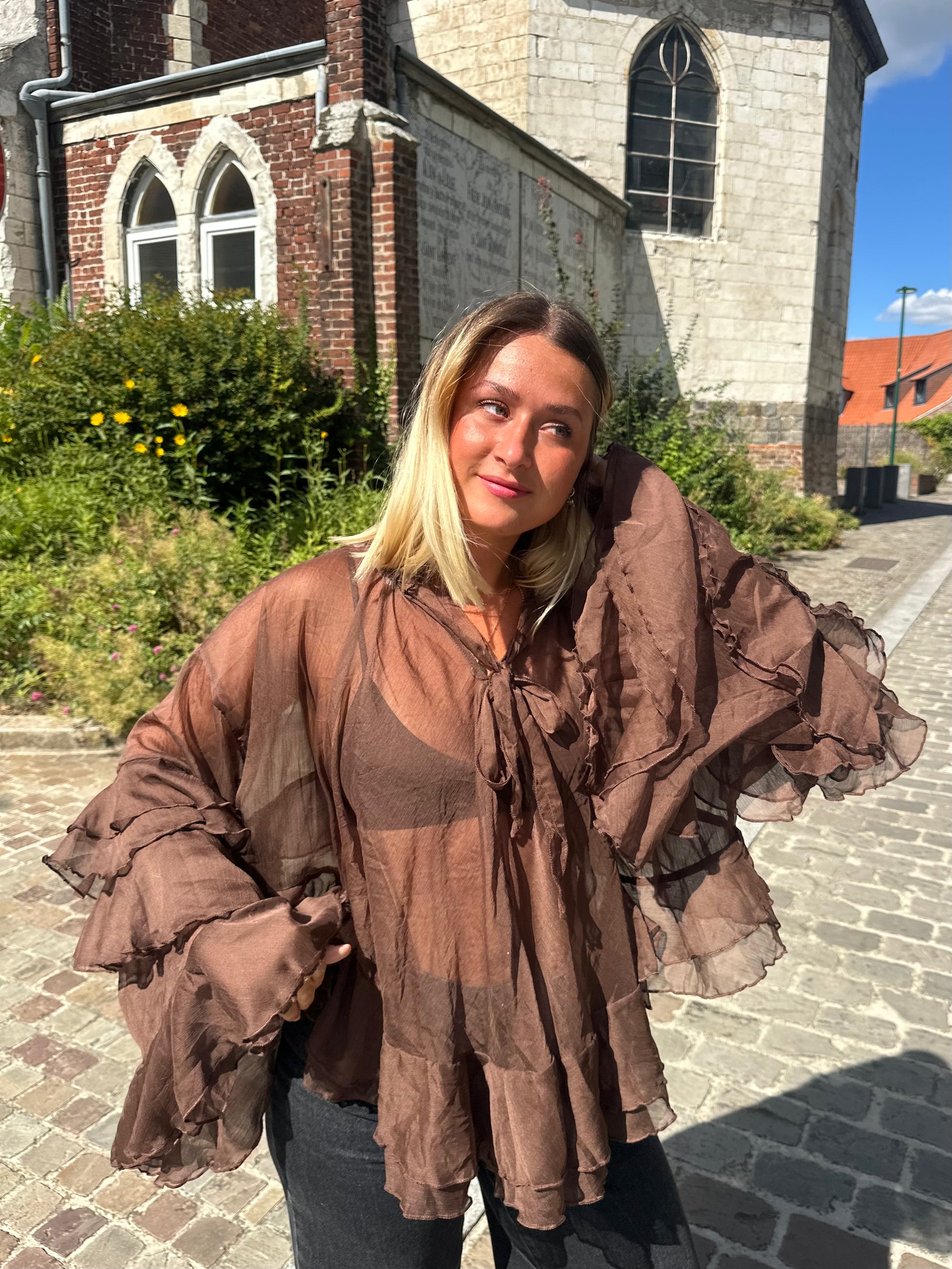 Légère et aérienne, cette blouse marron chocolat se distingue par ses superbes volants et sa transparence subtile. Elle apporte une touche bohème-chic à n’importe quelle tenue, tout en mettant en valeur la silhouette grâce à sa coupe ample et fluide. Le lien au col permet de jouer avec le style : noué pour un look romantique ou ouvert pour plus de décontraction. À porter avec un jean clair ou un pantalon habillé pour un contraste élégant. Une pièce forte et féminine à avoir dans son dressing.