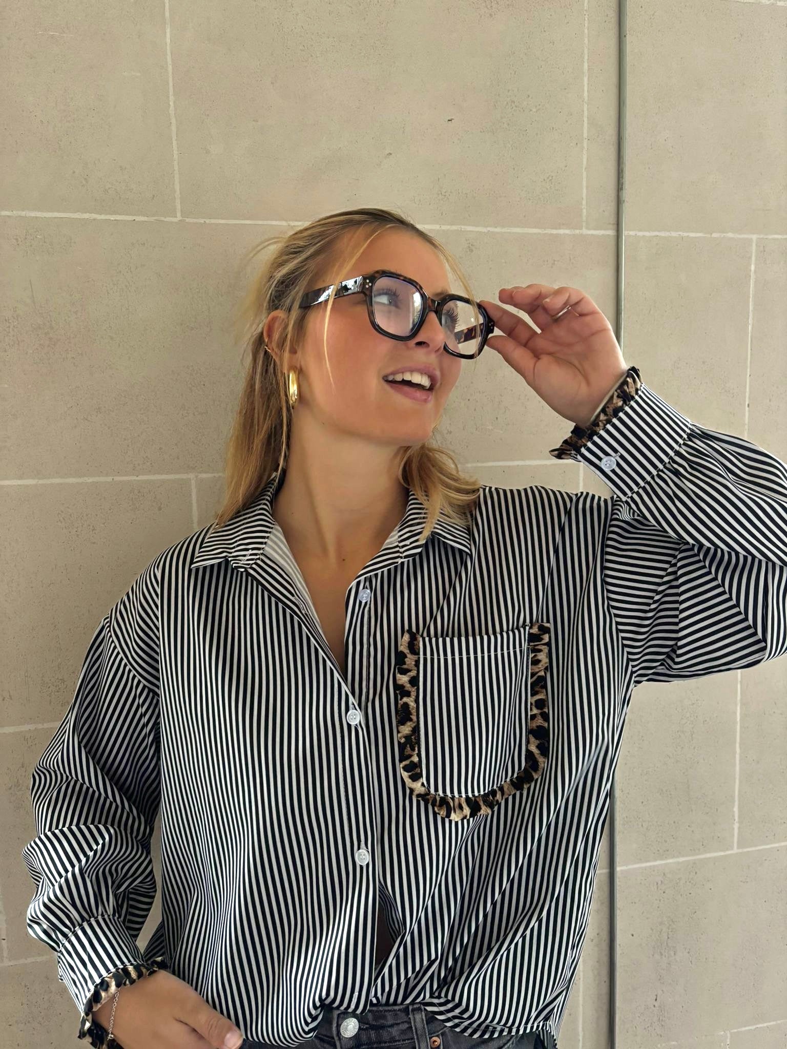 Chemise oversize rayée avec de subtils détails léopard sur les bords et la poche. Une pièce tendance qui mélange classique et audace. Facile à porter pour un look moderne et stylé.