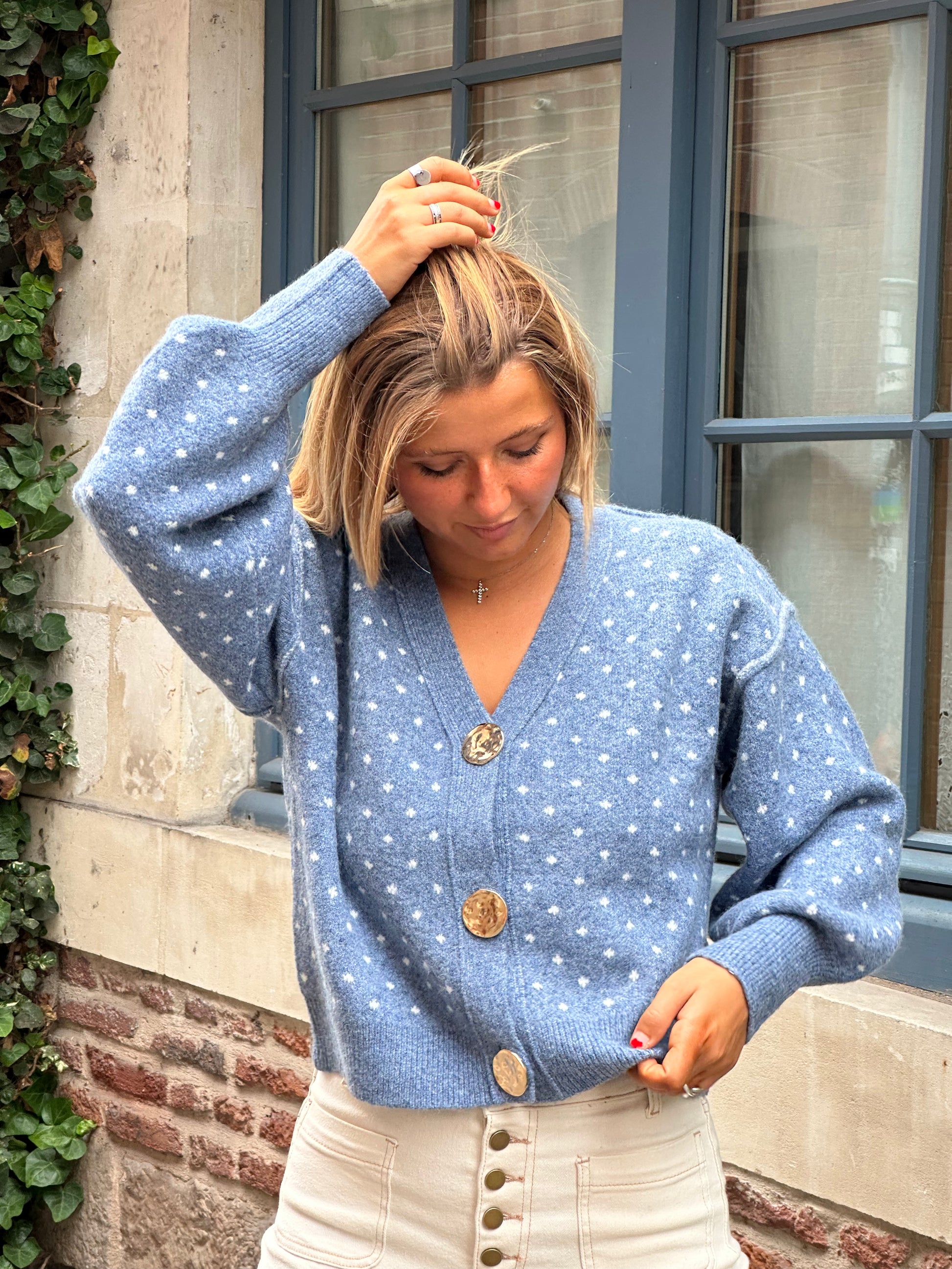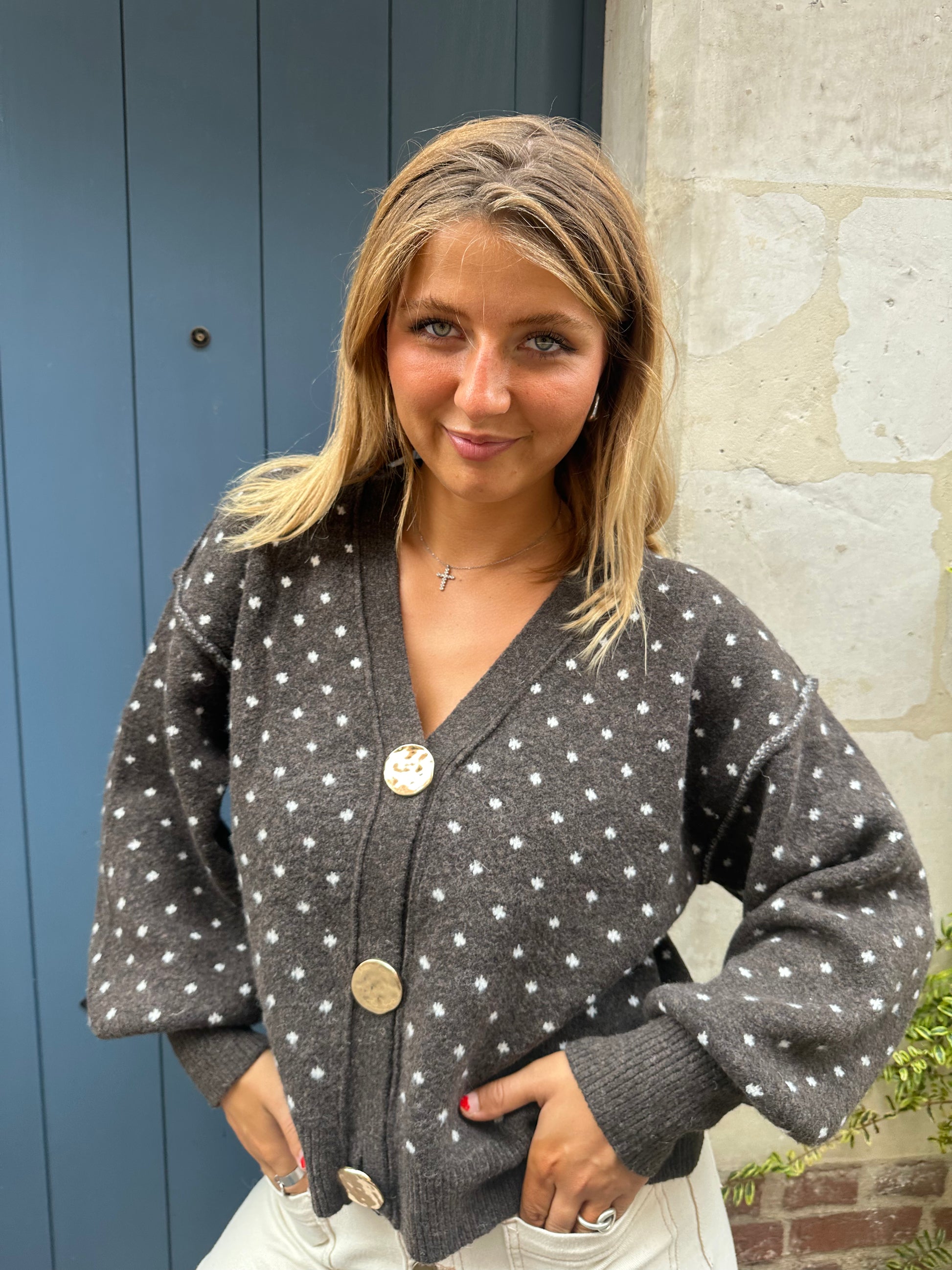 Chaud et tendance, ce gilet séduit par son col V élégant et ses boutons dorés qui apportent une touche chic. Sa coupe ample assure confort et modernité, tandis que son motif à pois lui donne un charme unique. Une pièce cosy et stylée, parfaite pour la mi-saison.