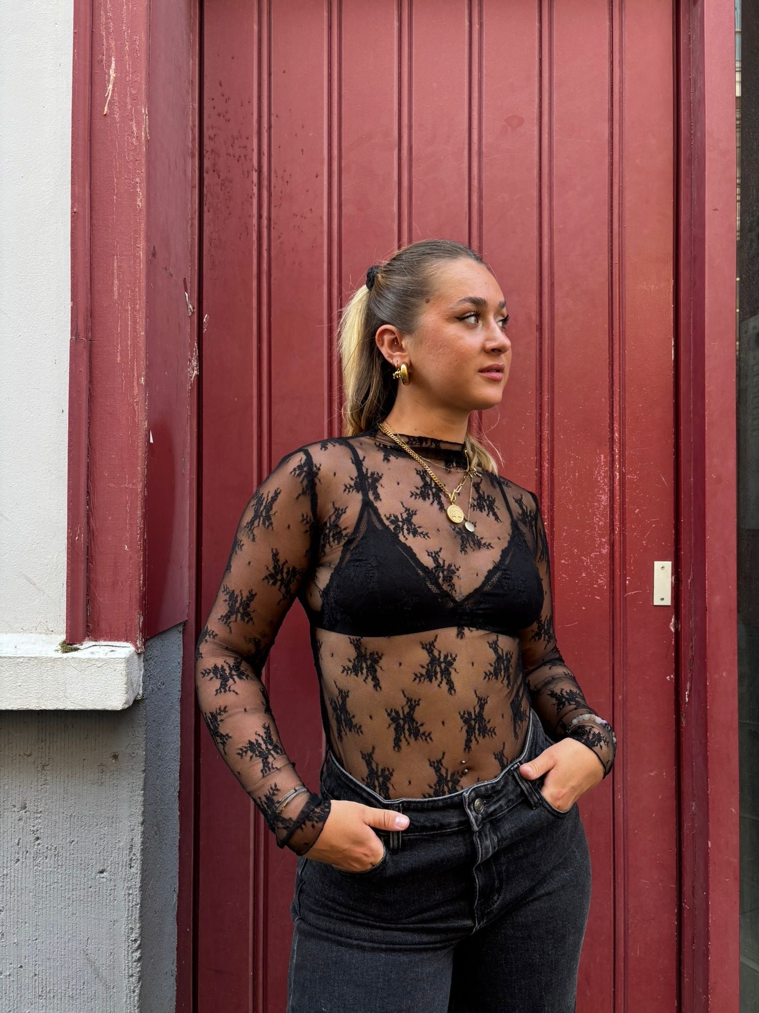 Féminin et audacieux, ce haut transparent noir façon dentelle dévoile subtilement la peau. Parfait avec un top fin, il donne une allure glamour et moderne. Une pièce idéale pour une soirée ou un look assumé.