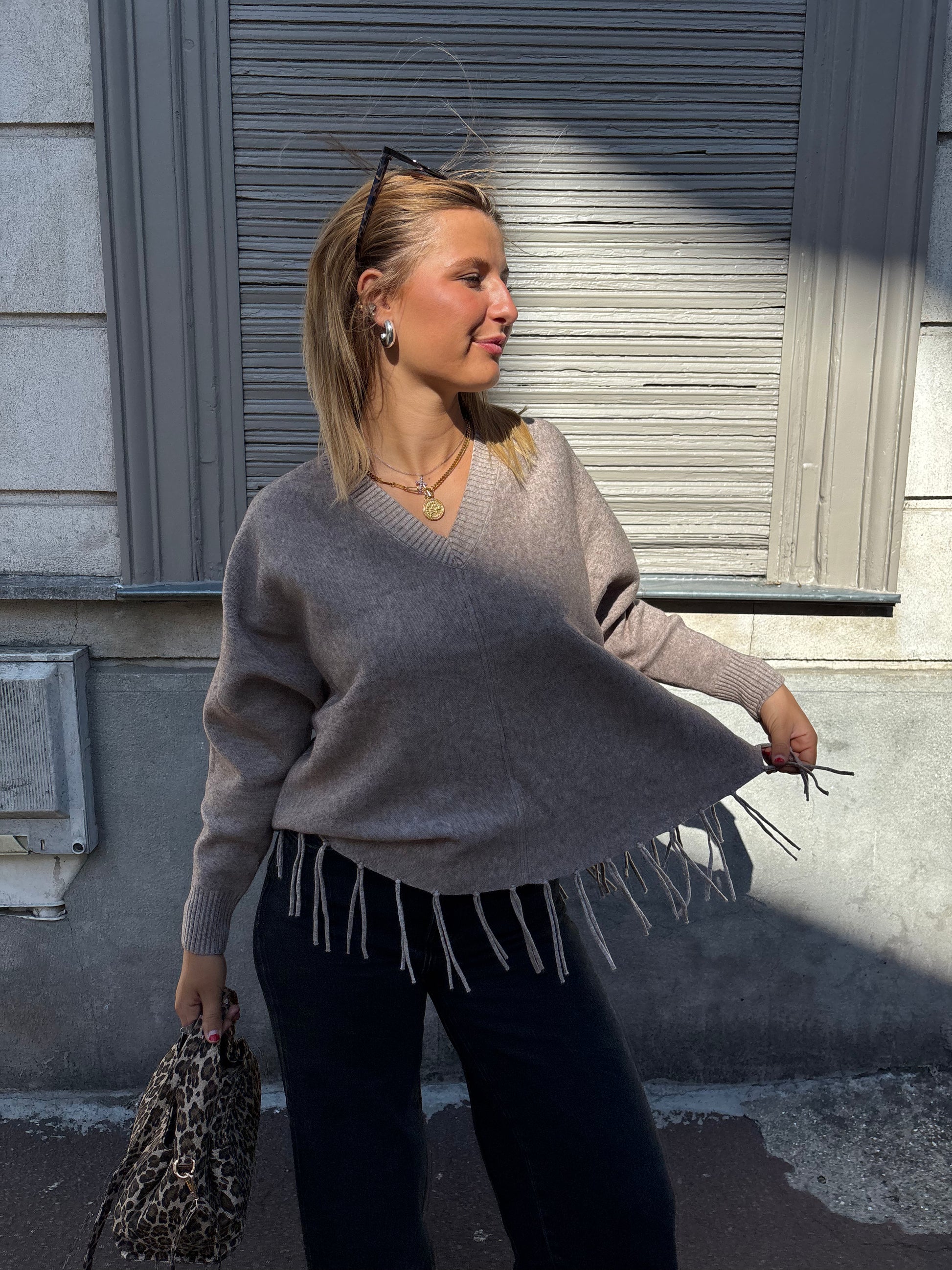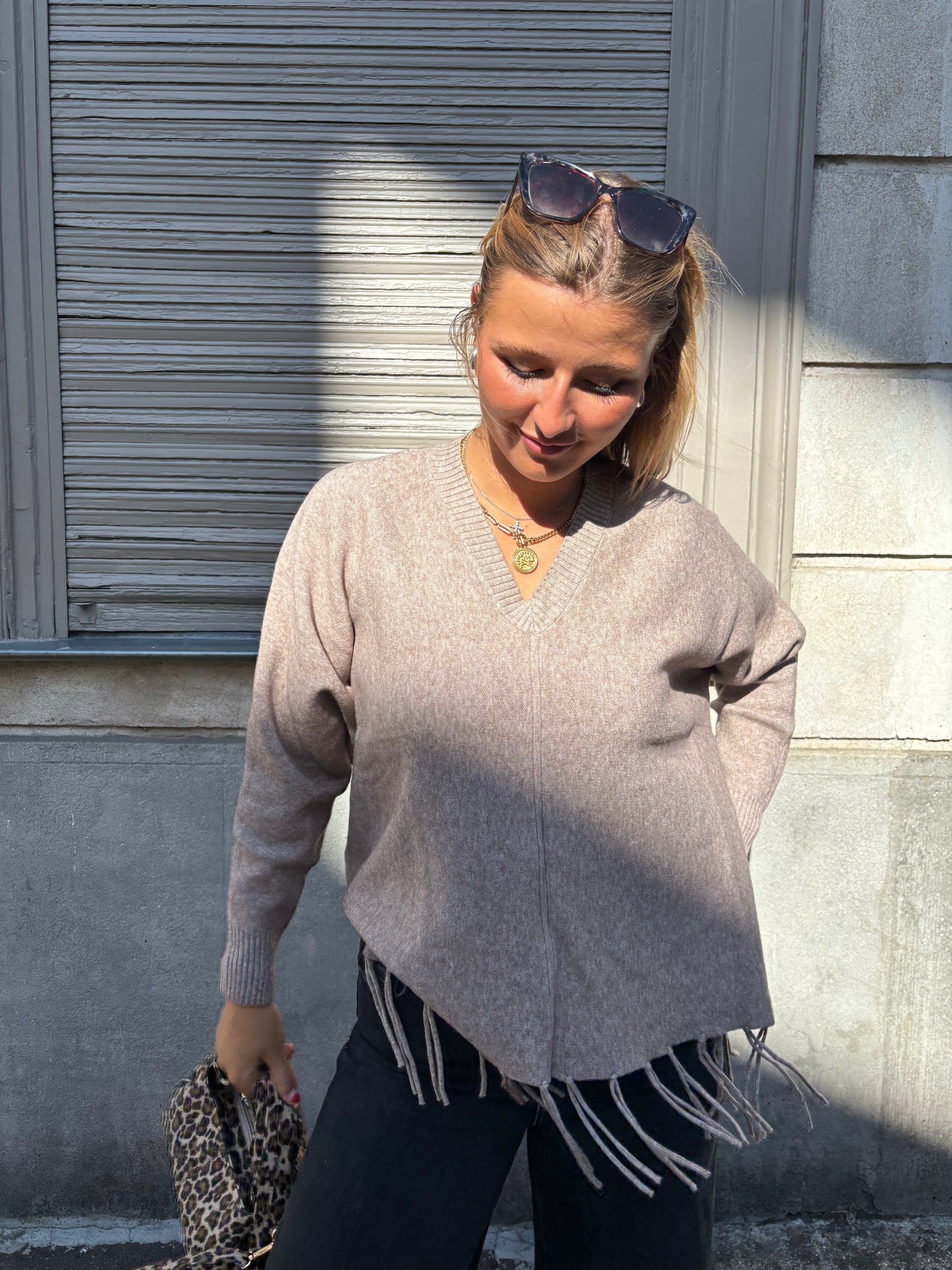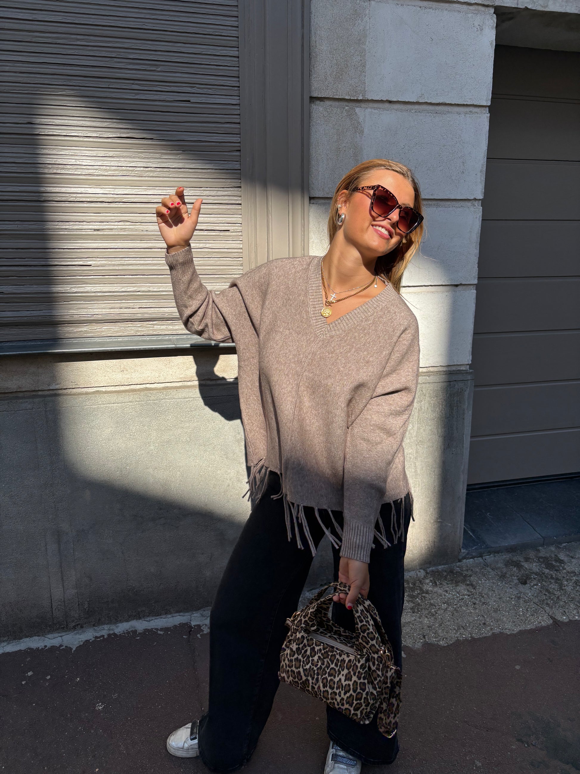 Original et bohème, ce pull col V marron clair séduit par sa coupe oversize et ses finitions à franges. Une pièce au charme unique, parfaite pour un look casual chic