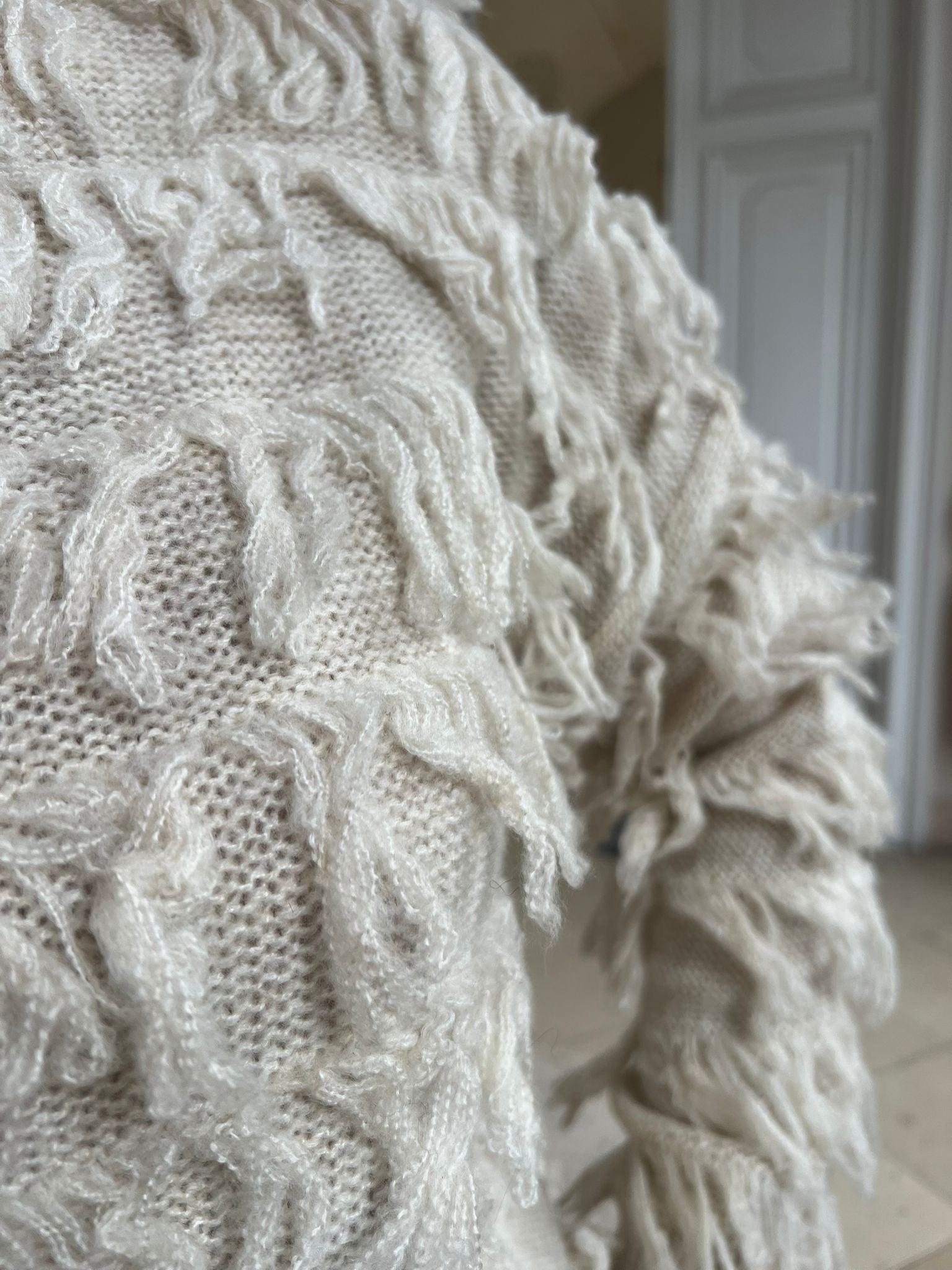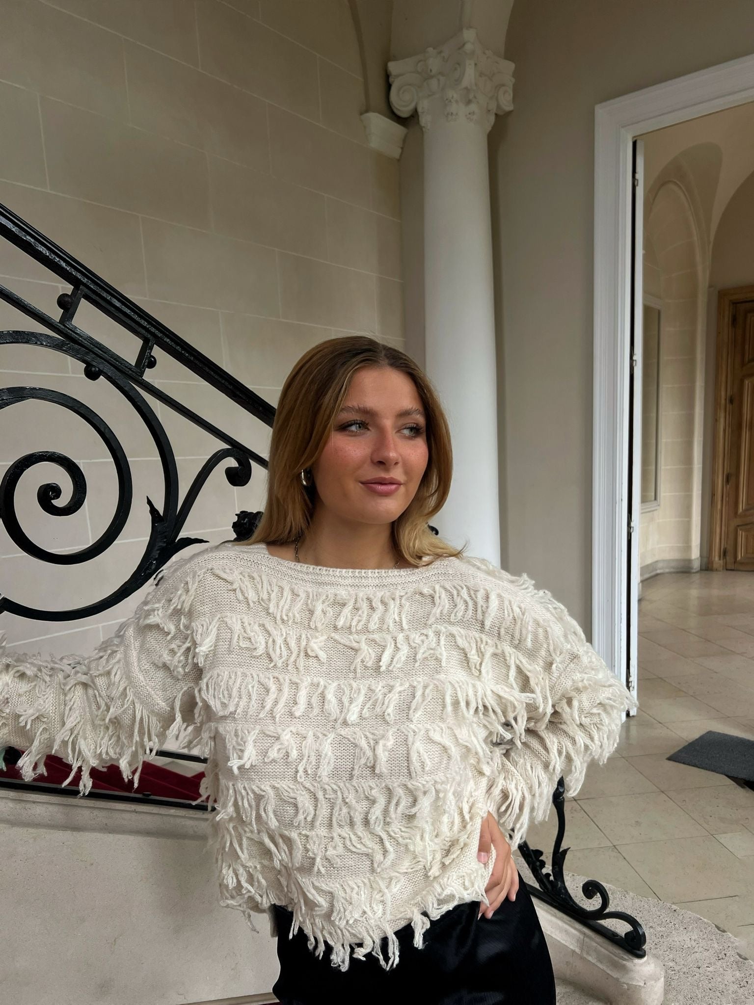 Pull blanc avec franges, doux au toucher et agréable à porter.