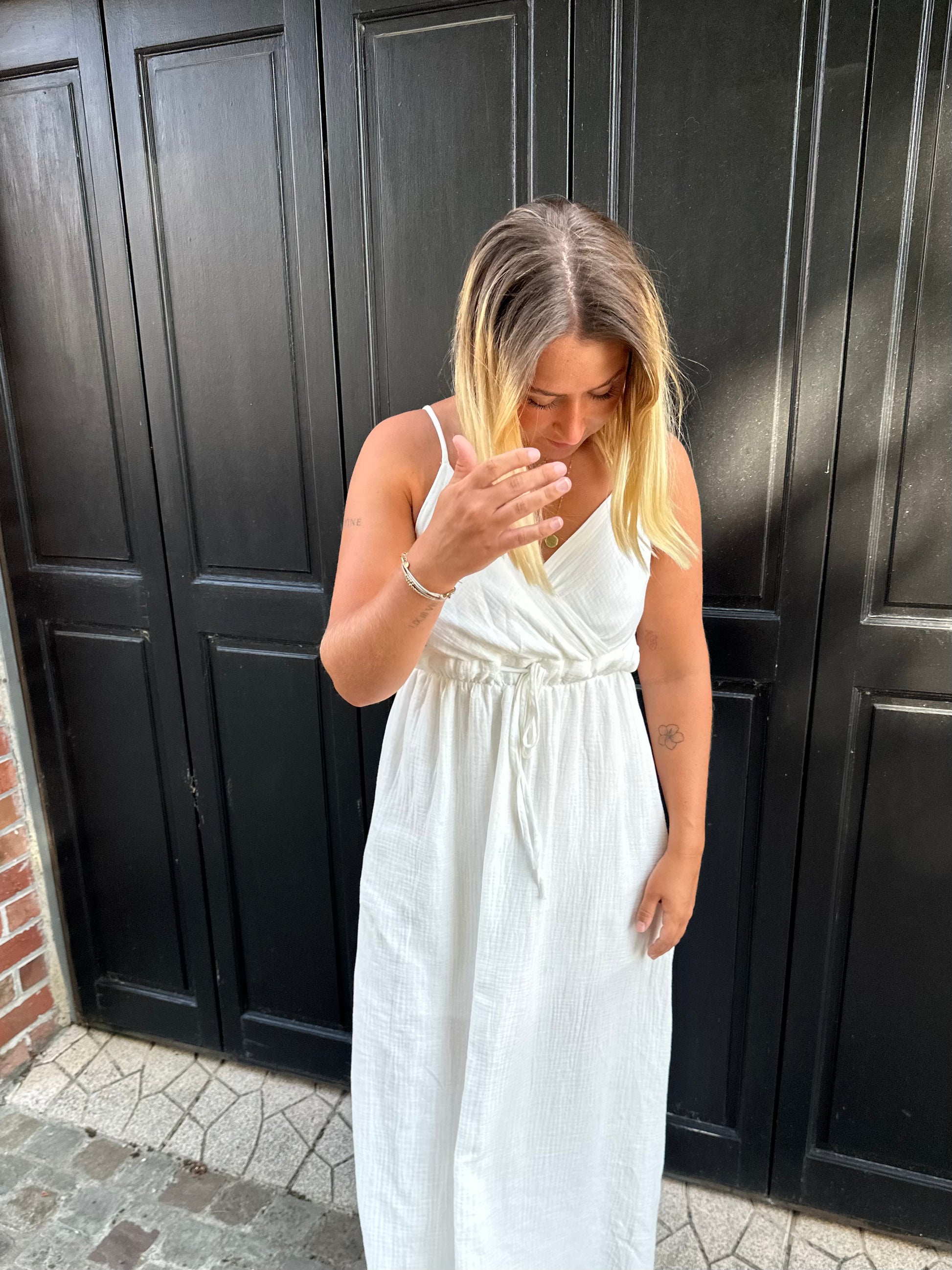 Robe longue blanche 100% coton, légère et respirante, idéale pour les journées ensoleillées. Ses fines bretelles et son décolleté en V subliment naturellement la silhouette, tandis que la ficelle à la taille permet de l’ajuster à souhait. Fluide et féminine, elle se porte aussi bien en balade décontractée qu’en soirée d’été. Un incontournable bohème chic.
