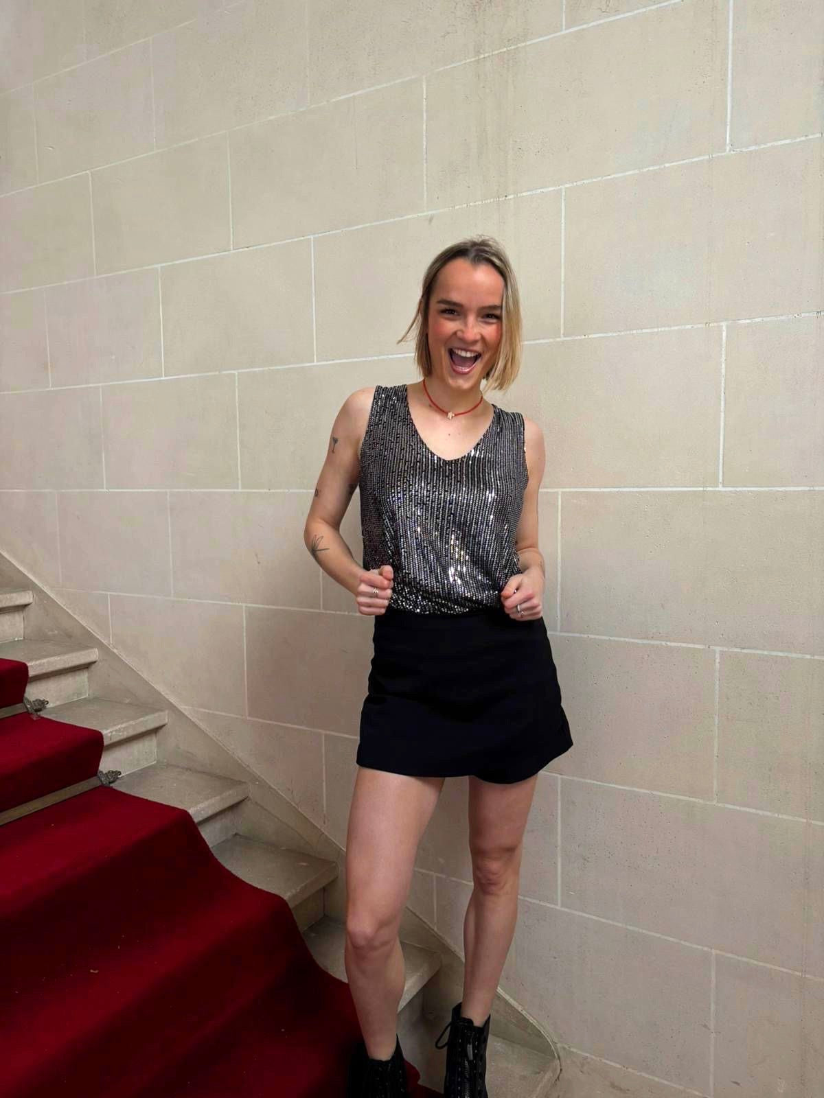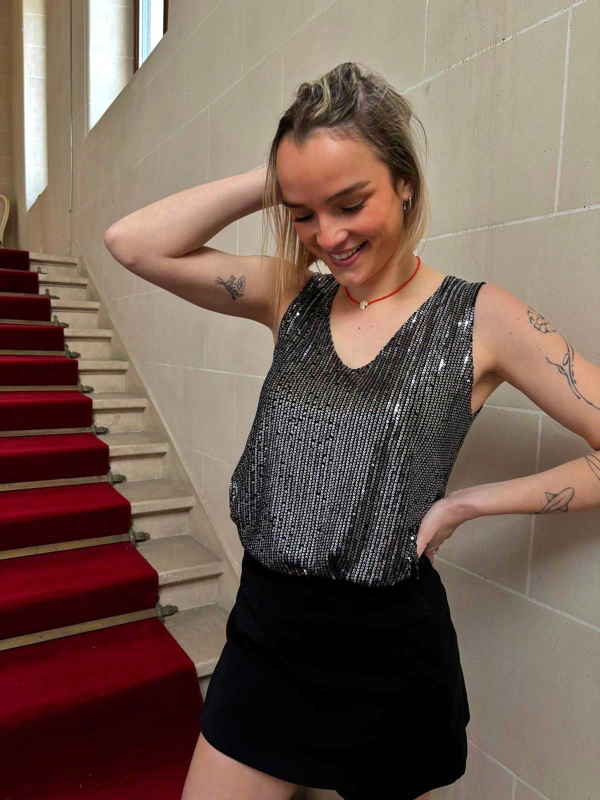 Un débardeur ultra-lumineux en sequins argentés, parfait pour briller en soirée. Sa coupe fluide et son encolure féminine mettent en valeur toutes les silhouettes. La pièce idéale pour un look chic et affirmé.